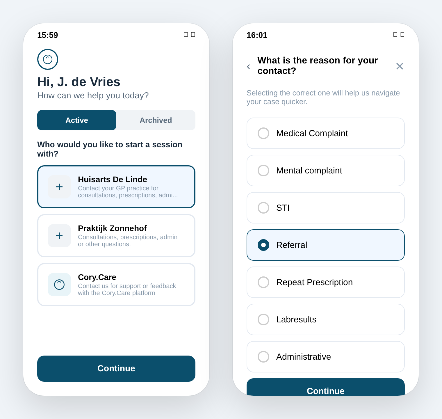 Cory.Care werkt samen met jouw huisartsenpraktijk om digitale zorg toegankelijk te maken. Je gebruikt Cory.Care alleen als jouw praktijk is aangesloten.